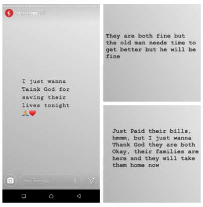 According to Broda Shaggi, he was scared at first to save the victims, but one of them, an old man was already loosing lot of blood, he had to take them both to a nearby hospital, to save their lives.